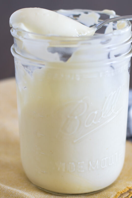 5. Detén la Thermomix y transfiere la mayonesa a un recipiente hermético.