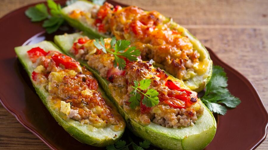 Deliciosos calabacines rellenos, un festín de sabores con gambas y champiñones.