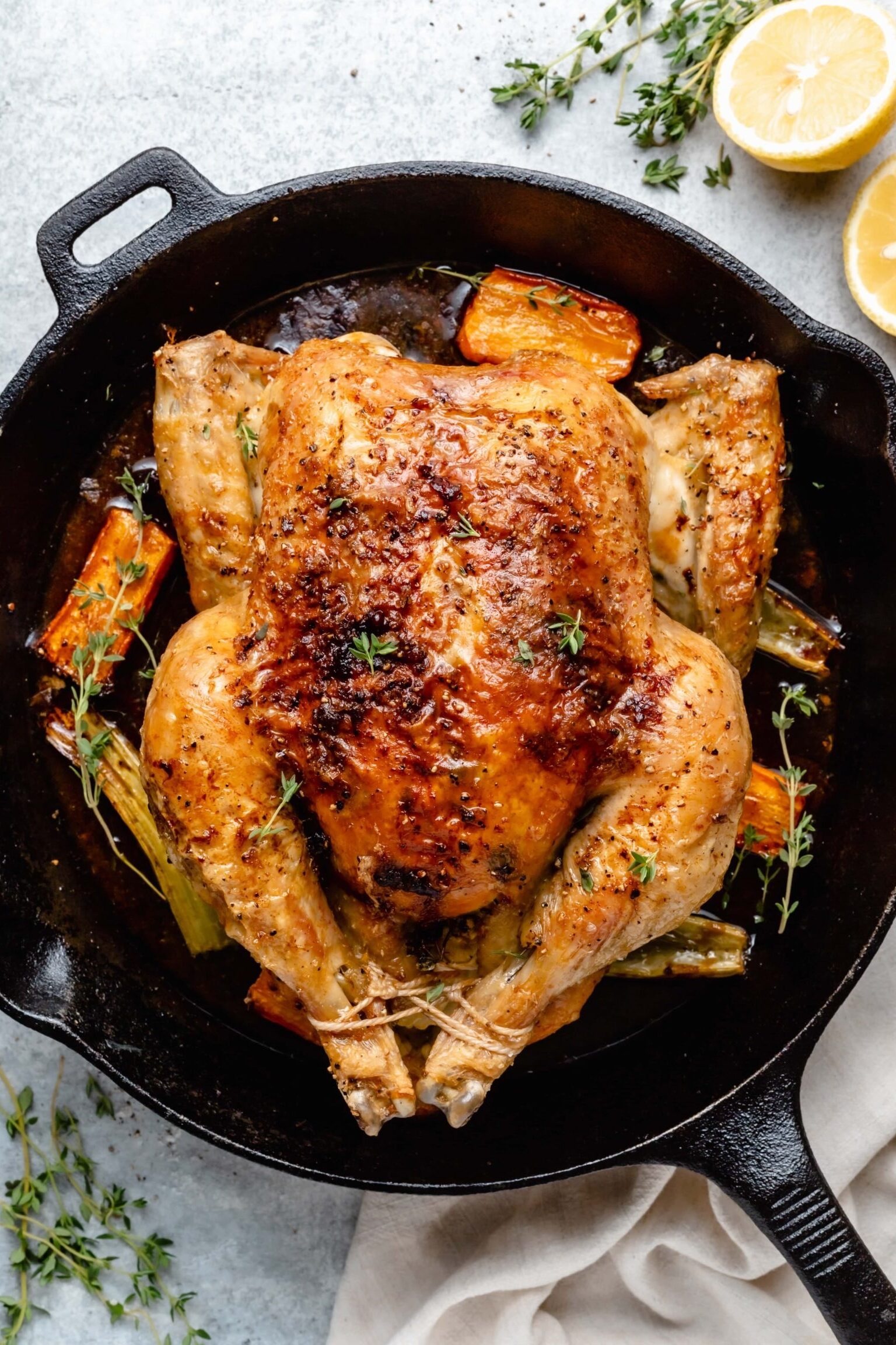 - Coloca algunas hierbas provenzales debajo de la piel del pollo y rocía con jugo de limón y vino blanco.