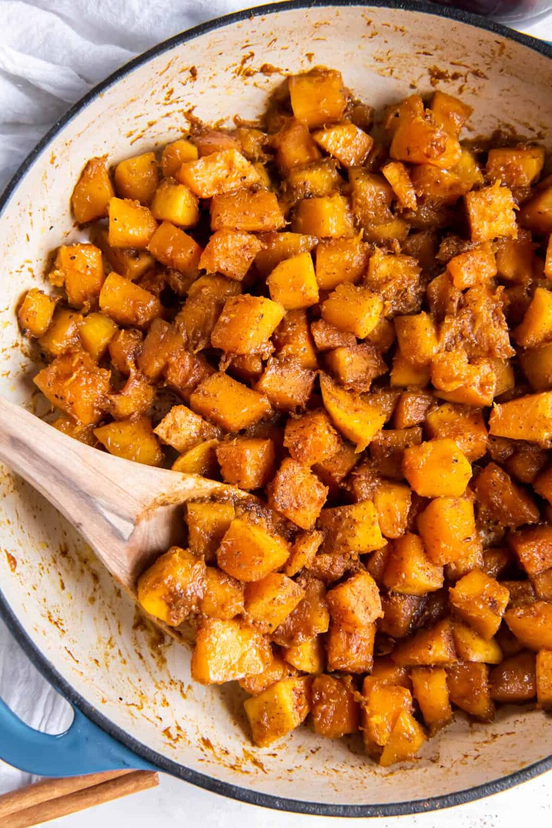 - Desglasa la sartén con un poco de agua y agrega los dientes de ajo. Deja que liberen sus jugos y agrega más agua si es necesario. Añade la calabaza, salpimienta y cocina hasta que empiece a reblandecerse.